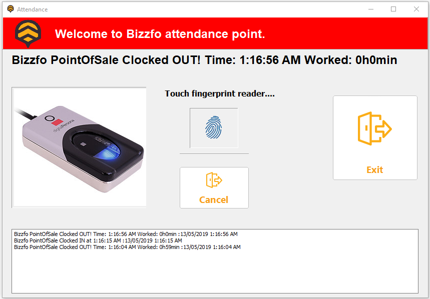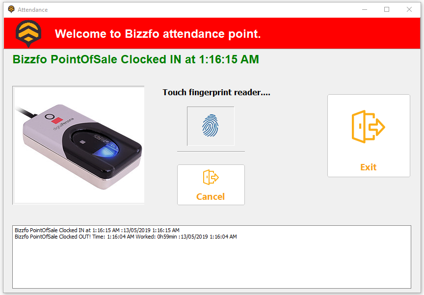 Users can clock in or out by touching the finger printer scanner.