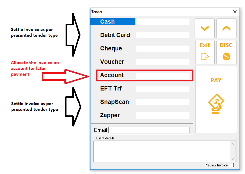 A client can either pay as per the normal tender types or a transaction can be put on account for later payment.