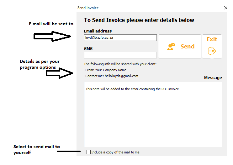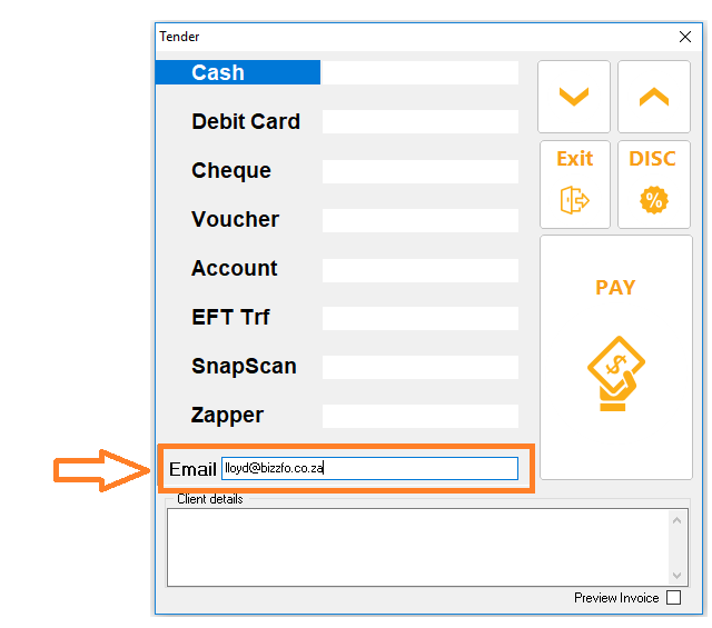 Enter the email address on the tender screen. Note, for client sales, the client e mail will be populated automatically