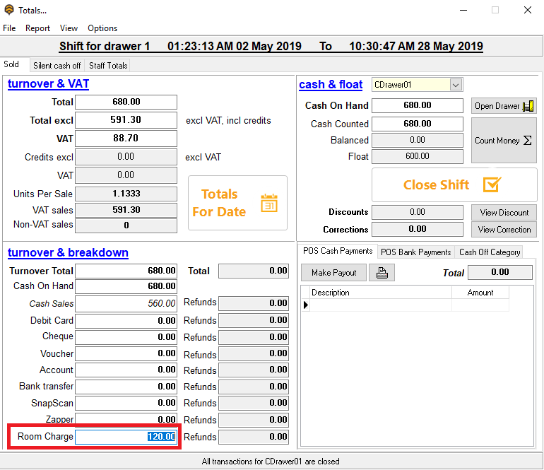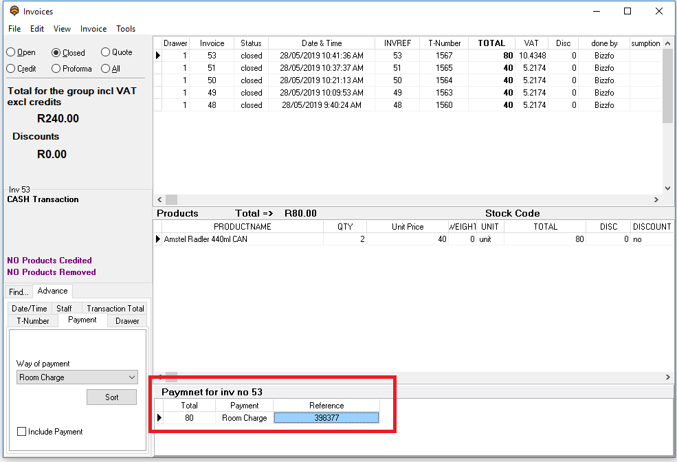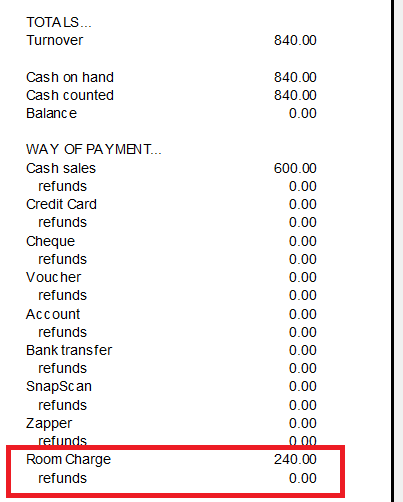 All room charges will be listed as below on Bizzfo Cashup screen - Room Charge