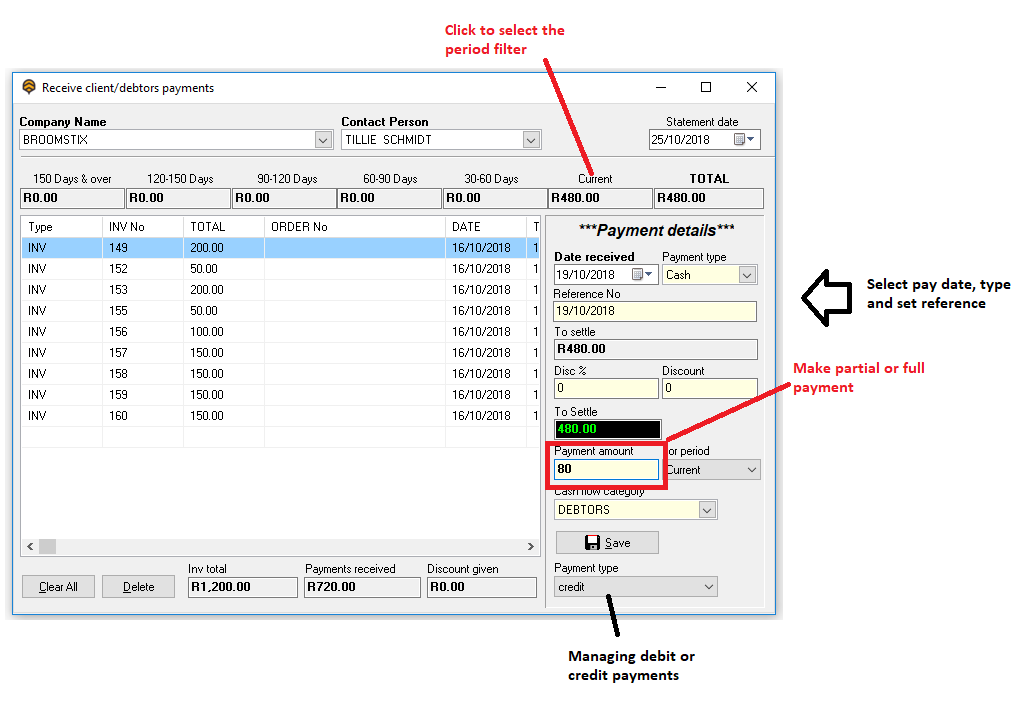 A client can either pay as per the normal tender types or a transaction can be put on account for later payment.